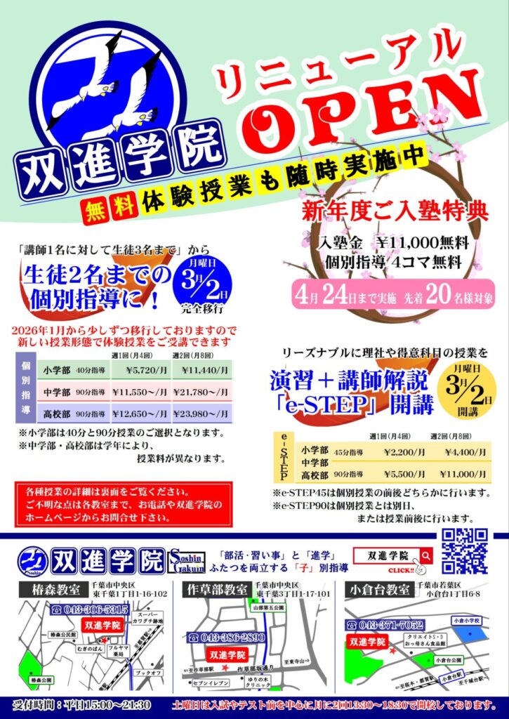 【都賀中・椿森中・みつわ台中 3年生】ご卒業おめでとうございます‼ 新年度特典 残り20名分⇒11名分‼【作草部教室】